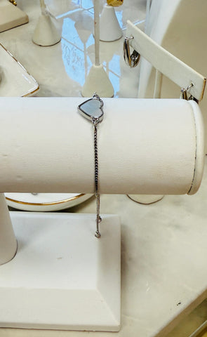 Elegant mother of pearl heart pendant adorns this adjustable slider bracelet, framed in gleaming silver detailing. The delicate heart, outlined in precious metal, glides smoothly along the silver-plated band, allowing you to customize the fit to your wrist. A refined piece that transitions effortlessly from day to evening, combining timeless romance with understated luxury.