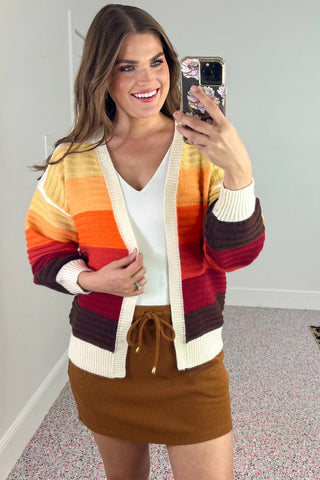 Embrace the essence of autumn with the Jess Lea Fall Cardigan, a sophisticated layering piece that captures the season's most captivating color story. This cardigan showcases a stunning ombre gradient flowing through rich autumn hues—from warm golds and burnt oranges to deep burgundies and chocolate tones. Perfect for transitioning between seasons, it adds refined elegance to any ensemble while celebrating the natural beauty of fall. Versatile enough for casual styling or polished occasions, this piece becomes an essential addition to your seasonal wardrobe.