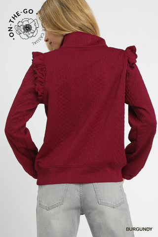 This Umgee Burgundy Cable Knit Pullover features a refined half-zip design and elegant ruffle trim detailing along the long sleeves, adding a subtle touch of sophistication. Crafted from cozy knit fabric, it promises warmth and comfort while maintaining a polished appearance, perfect for layering in cooler weather.